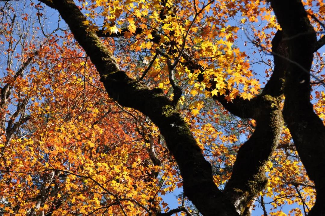 而深秋時(shí)節(jié),火紅的楓葉和紅砂巖形成的紅崖絕壁相互呼應(yīng),又是另一番迷人的景象。