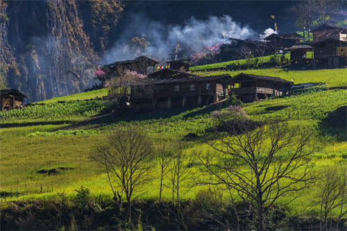 十里不同天,這邊下雨那邊晴。雪邦山上還云霧繚繞,遠處的蘭坪縣城確不然,放眼望去,正蓬勃發(fā)展的“三江之門,綠色鋅都”閃現在云里霧里,夢幻無窮。剎那間,濃云翻卷而來,穿過眼前的山梁,還來不及細細品味,便吞沒了視線里的“鄉(xiāng)愁”。