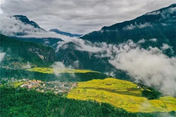 10月,丙中洛的稻谷追趕著時令,終于從一大片連接天地綠色的臥毯中,顯露出張揚的個性。稻田里,稻子一穗穗彎成鐮,伴隨著豐收的喜悅,每一穗都鼓足勁地飽滿,每一坰都變幻著彩妝……