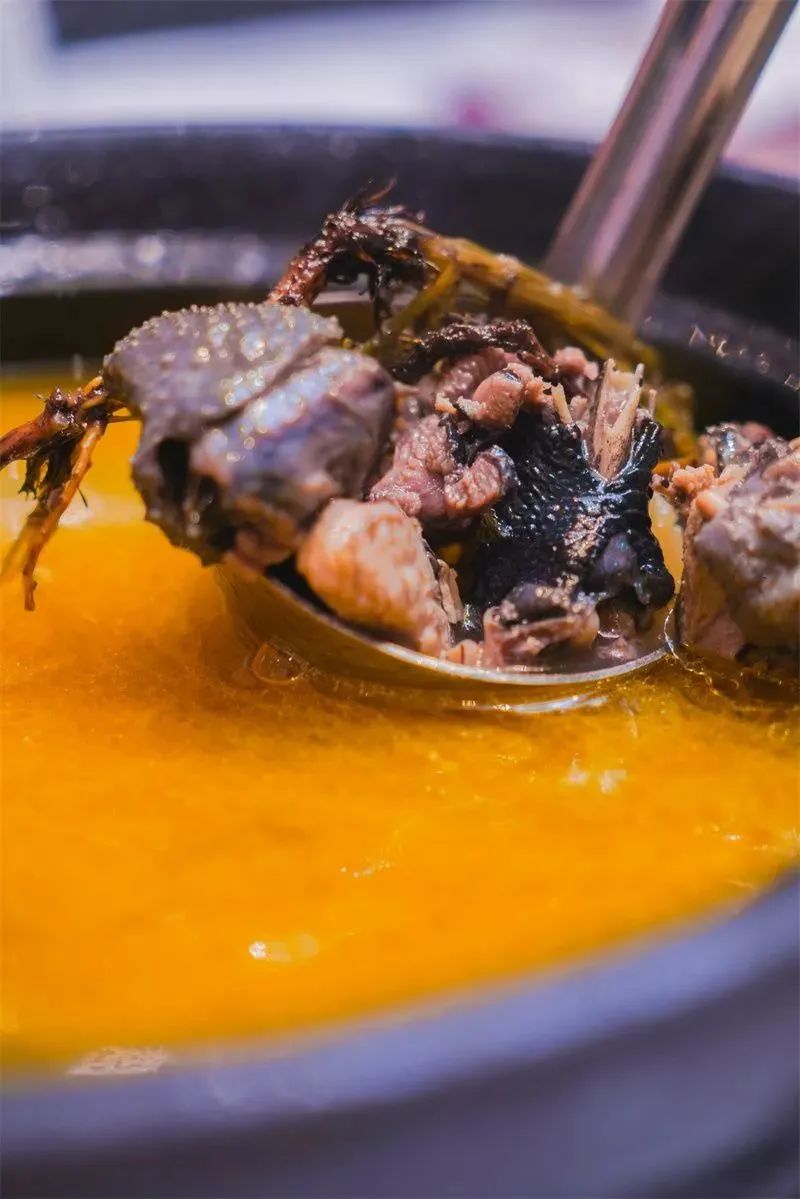 結(jié)束一天的行程,喝上一碗暖暖的熱湯,暖身又暖心。怒江特有的木楸雞、漆油雞、花椒雞,采用純天然食材燉煮,鮮香可口,再配一盤咸香的琵琶肉和在青石板上烤出來的石板粑粑,不僅滿足了口腹之欲,也撫慰了一身的疲憊。
